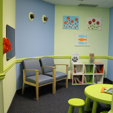 A fun and playful waiting area for a pediatrician. Youthful colors combined with wall decals create an inviting space for children and parents alike.