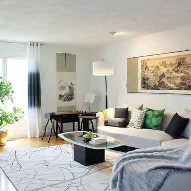 This spacious, sun-filled living room was a great inspiration to create a formal sitting room where the owners could entertain their guests and play traditional Chinese Guzheng. The owners were open to a contemporary design, but it was also important to celebrate the cultural heritage of one of the owners. Chic created a space that is formal and still inviting, combining contemporary lines and surfaces with traditional artwork and decor accent.